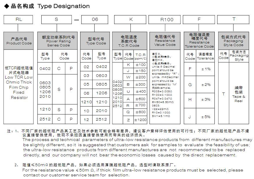風(fēng)華低TCR超低阻厚膜片式固定電阻型號(hào)表示方法: