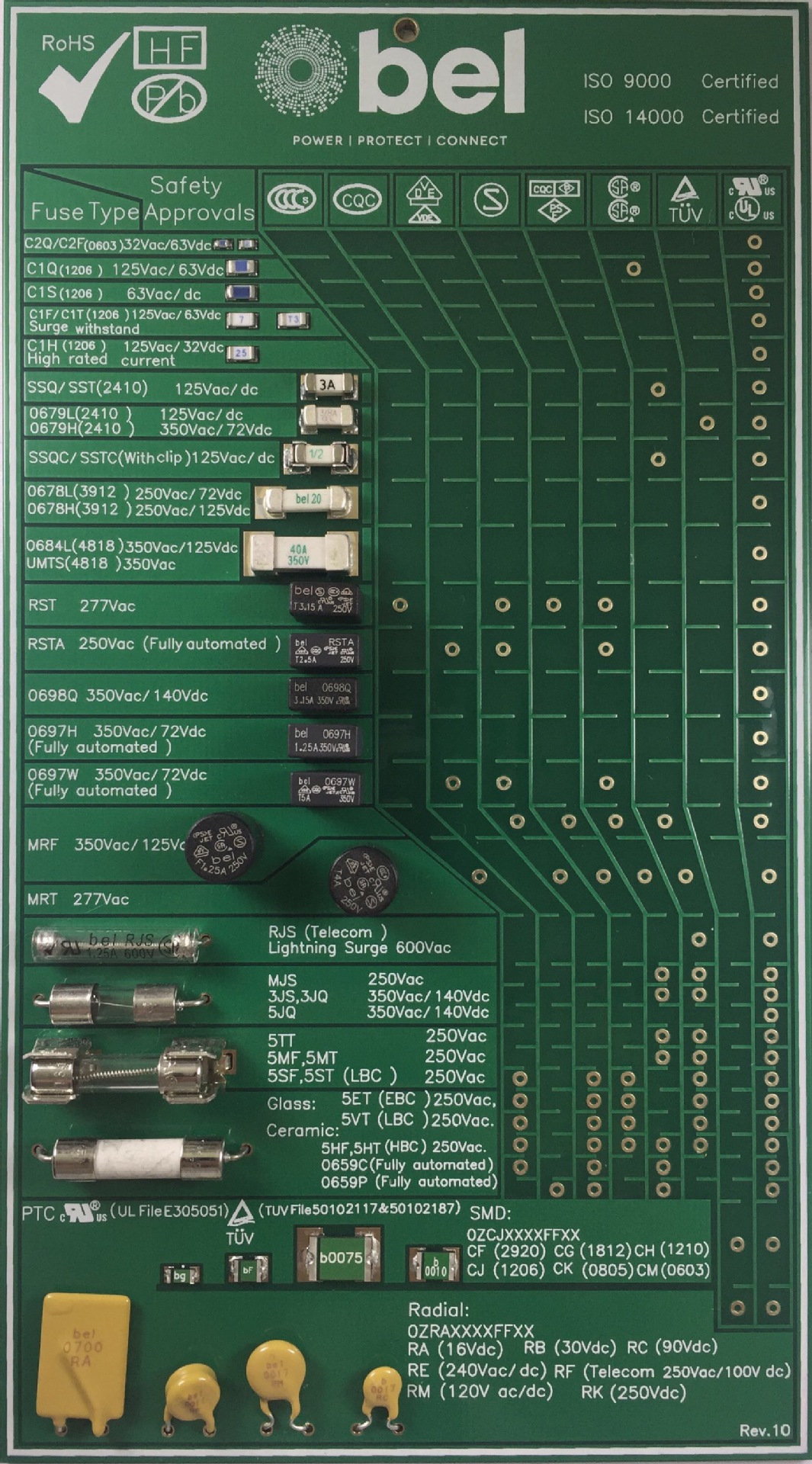 Bel Fuse-Circuit Protection 提供廣泛的 PCB 安裝、表面貼裝和 PTC 自恢復保險絲。PCB 安裝產品包括徑向、標準玻璃和陶瓷管狀保險絲。該公司已經走在行業向表面貼裝保險絲設計(諸如磚式和片式保險絲)轉型升級的前沿,解決了人們對小而緊湊的技術的需求。Bel Fuse-Circuit Protection 還提供完整的 PTC 自恢復保險絲產品線,同時具有表面貼裝和徑向封裝選擇。這些保險絲產品有許多第三方機構按照各種各樣的性能標準進行了認證。認證標志授權機構如 UL、CSA、PSE、CCC、VDE 和 Semko。這些保險絲和 PTC 自恢復產品全部符合 RoHS 2 規范