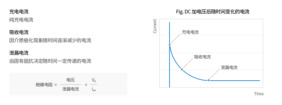 絕緣電阻(Insulation resistance)是額定電壓除以泄漏電流的值,是泄漏電流加定額電壓時(shí),電極兩端發(fā)生的電流。絕緣電阻通常以 MΩ 為單位,當(dāng)直接加電壓時(shí),如圖所示,產(chǎn)生充電電流,加電壓后等待60秒后,測(cè)量絕緣電阻。