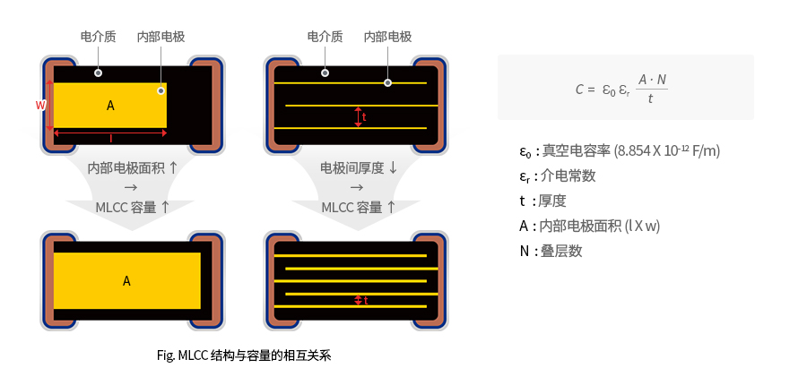MLCC 容量如下所示,與電容率、內(nèi)部電極面積、疊層數(shù)量呈成正比,與電介質(zhì)厚度成反比。電介質(zhì)厚度越薄,容量就會(huì)越高,這是電介質(zhì)兩面所加電場(chǎng)數(shù)的差異導(dǎo)致的。